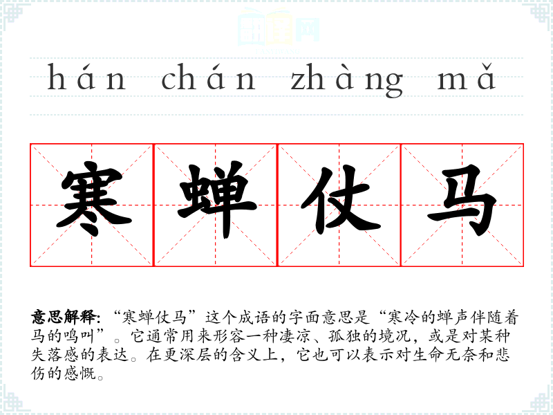 成语“寒蝉仗马”源自古代文学作品,特别是唐诗和宋词中常见的意象,如寒蝉的凄鸣常常被用来象征孤独和悲伤。此成语的具体出处可能并不明确,但其所传达的情感在古代文学中广泛存在,体现了文人对自然和人生的深刻思考。