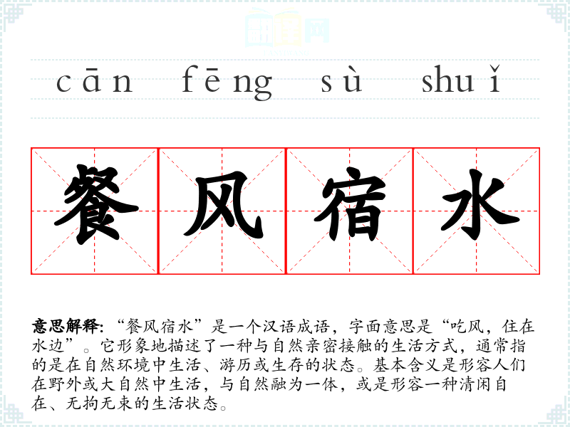 “餐风宿水”是一个汉语成语,字面意思是“吃风,住在水边”。它形象地描述了一种与自然亲密接触的生活方式,通常指的是在自然环境中生活、游历或生存的状态。基本含义是形容人们在野外或大自然中生活,与自然融为一体,或是形容一种清闲自在、无拘无束的生活状态。