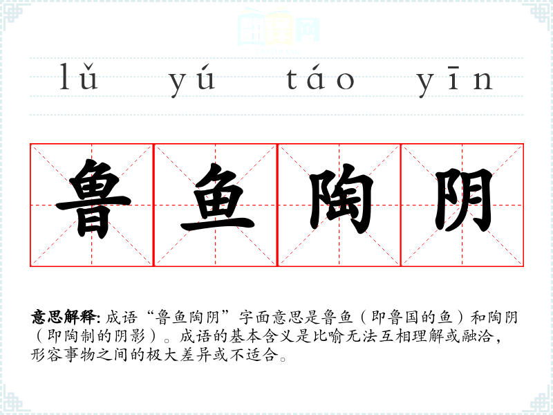 成语“鲁鱼陶阴”字面意思是鲁鱼(即鲁国的鱼)和陶阴(即陶制的阴影)。成语的基本含义是比喻无法互相理解或融洽,形容事物之间的极大差异或不适合。