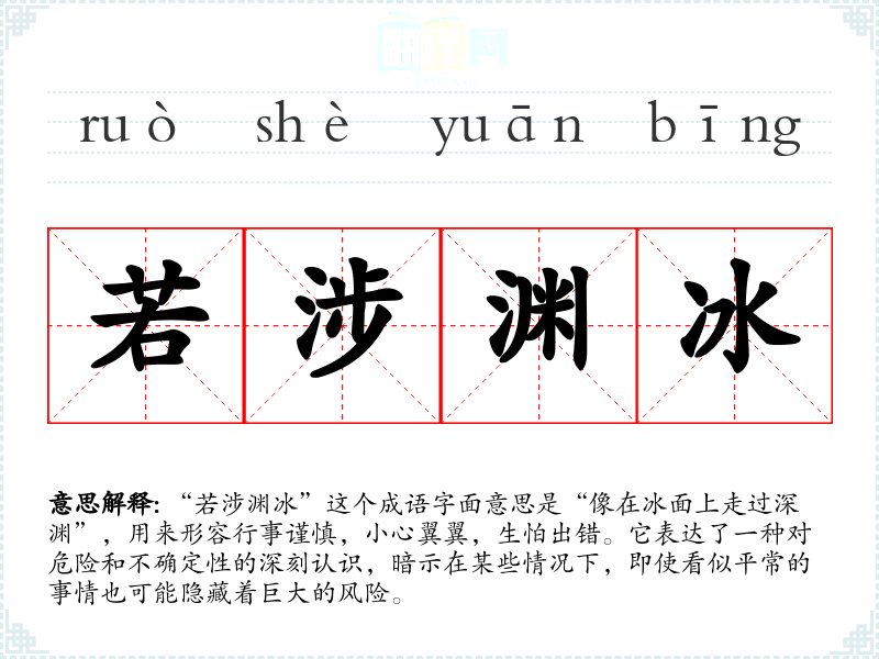 该成语出自《诗经·小雅·车辖》中的一句:“若涉渊冰,岂敢忘忧。”意在强调在面对危险时,必须保持高度警惕与谨慎。成语的形成与古代人们对自然环境的认知密切相关,尤其是在冰雪覆盖的环境中,行走时的风险感受。