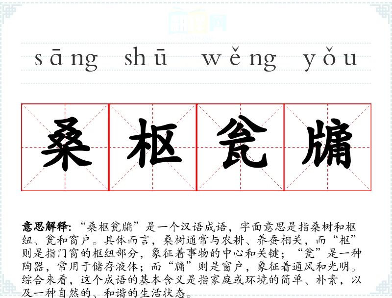 “桑枢瓮牖”是一个汉语成语,字面意思是指桑树和枢纽、瓮和窗户。具体而言,桑树通常与农耕、养蚕相关,而“枢”则是指门窗的枢纽部分,象征着事物的中心和关键;“瓮”是一种陶器,常用于储存液体;而“牖”则是窗户,象征着通风和光明。综合来看,这个成语的基本含义是指家庭或环境的简单、朴素,以及一种自然的、和谐的生活状态。