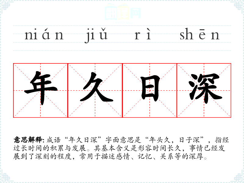 成语“年久日深”字面意思是“年头久,日子深”,指经过长时间的积累与发展。其基本含义是形容时间长久,事情已经发展到了深刻的程度,常用于描述感情、记忆、关系等的深厚。