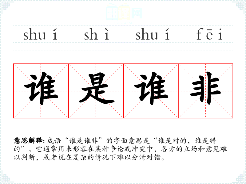 - 文学作品:作家在描绘人物冲突时,常用“谁是谁非”来表现争论的复杂性。