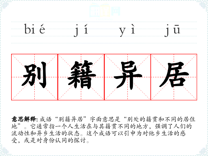 成语“别籍异居”字面意思是“别处的籍贯和不同的居住地”。它通常指一个人生活在与其籍贯不同的地方,强调了人们的流动性和异乡生活的状态。这个成语可以引申为对他乡生活的感受,或是对身份认同的探讨。