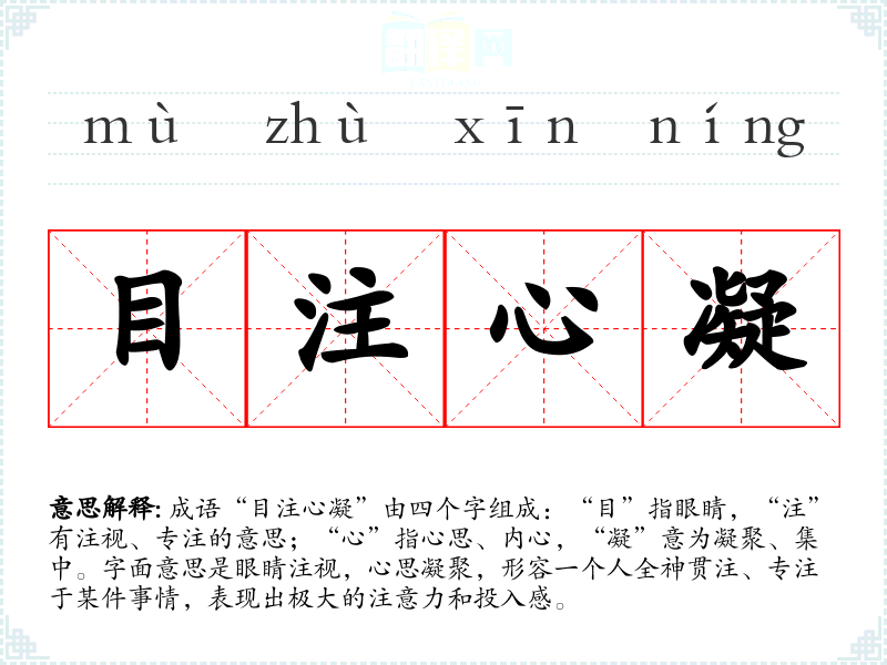 成语“目注心凝”由四个字组成:“目”指眼睛,“注”有注视、专注的意思;“心”指心思、内心,“凝”意为凝聚、集中。字面意思是眼睛注视,心思凝聚,形容一个人全神贯注、专注于某件事情,表现出极大的注意力和投入感。