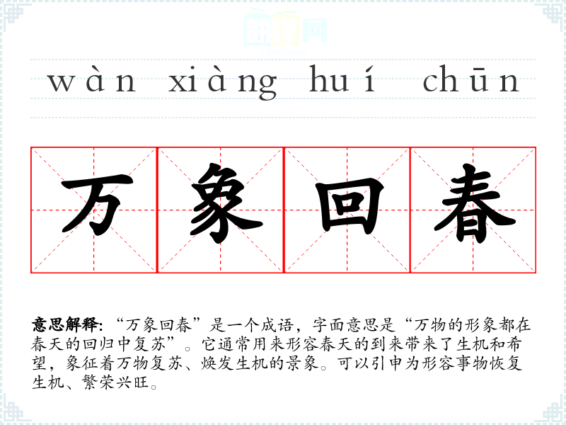 | 万象回春 | 万象:一切景象。指各种事物都出现了生机。 |