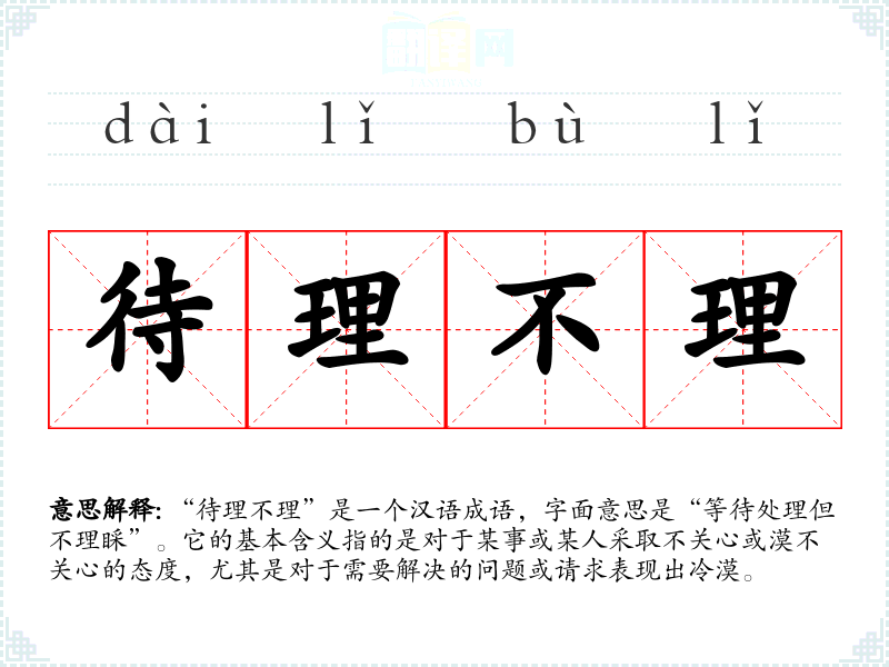 “待理不理”是一个汉语成语,字面意思是“等待处理但不理睬”。它的基本含义指的是对于某事或某人采取不关心或漠不关心的态度,尤其是对于需要解决的问题或请求表现出冷漠。