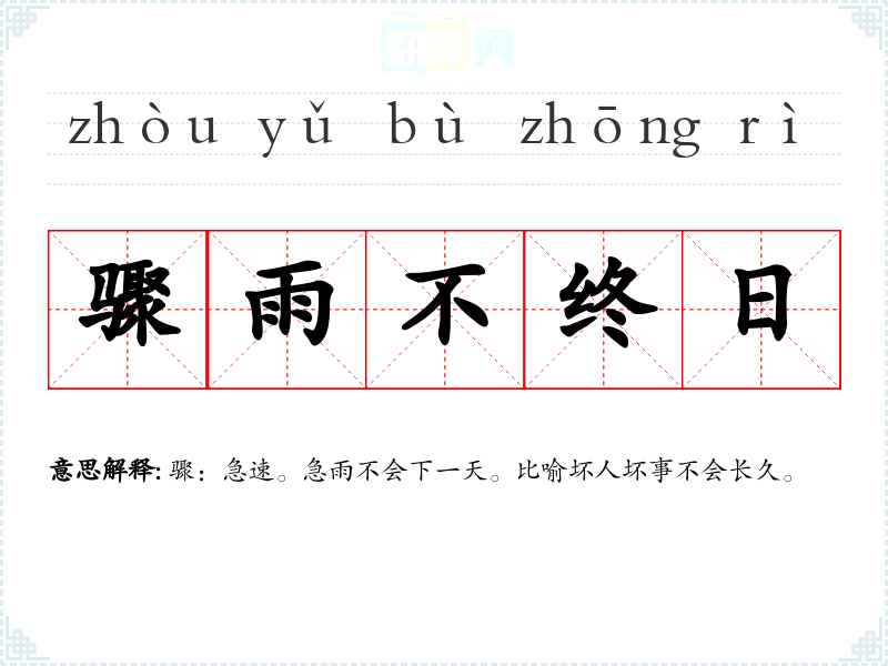 骤:急速。急雨不会下一天。比喻坏人坏事不会长久。 |
