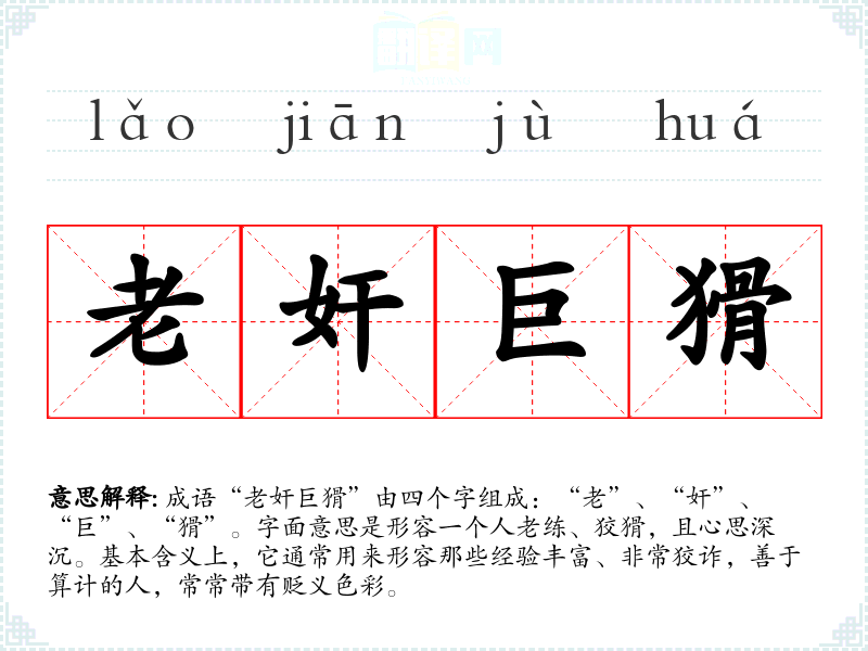 成语“老奸巨猾”由四个字组成:“老”、“奸”、“巨”、“猾”。字面意思是形容一个人老练、狡猾,且心思深沉。基本含义上,它通常用来形容那些经验丰富、非常狡诈,善于算计的人,常常带有贬义色彩。