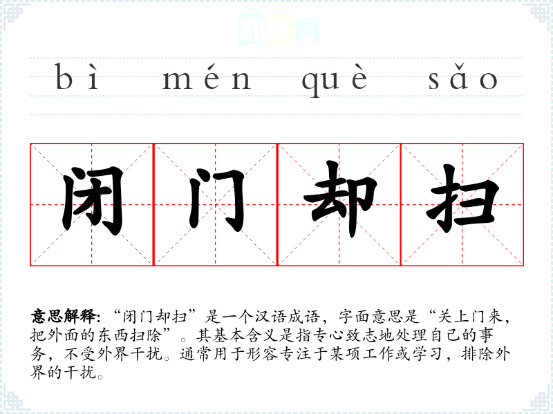 “闭门却扫”是一个汉语成语,字面意思是“关上门来,把外面的东西扫除”。其基本含义是指专心致志地处理自己的事务,不受外界干扰。通常用于形容专注于某项工作或学*,排除外界的干扰。