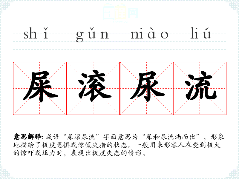 成语“屎滚尿流”字面意思为“屎和尿流淌而出”,形象地描绘了极度恐惧或惊慌失措的状态。一般用来形容人在受到极大的惊吓或压力时,表现出极度失态的情形。