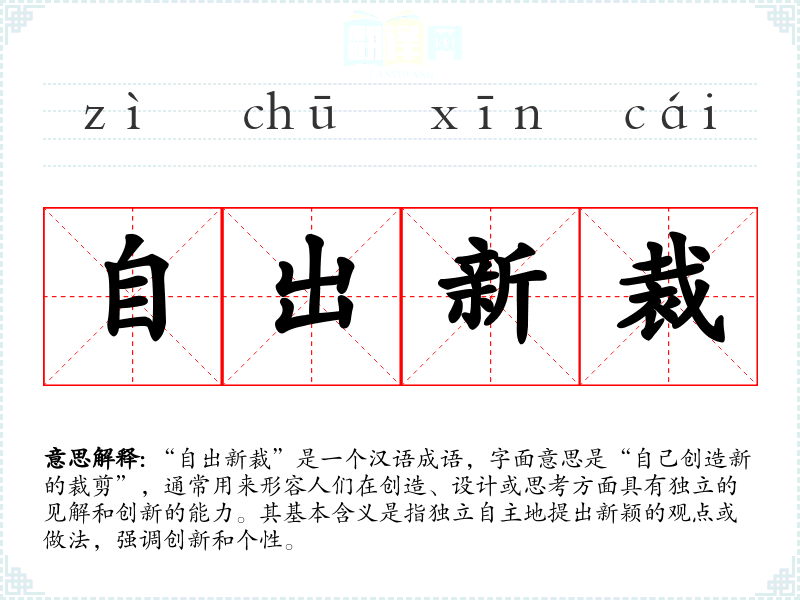 “自出新裁”是一个汉语成语,字面意思是“自己创造新的裁剪”,通常用来形容人们在创造、设计或思考方面具有独立的见解和创新的能力。其基本含义是指独立自主地提出新颖的观点或做法,强调创新和个性。