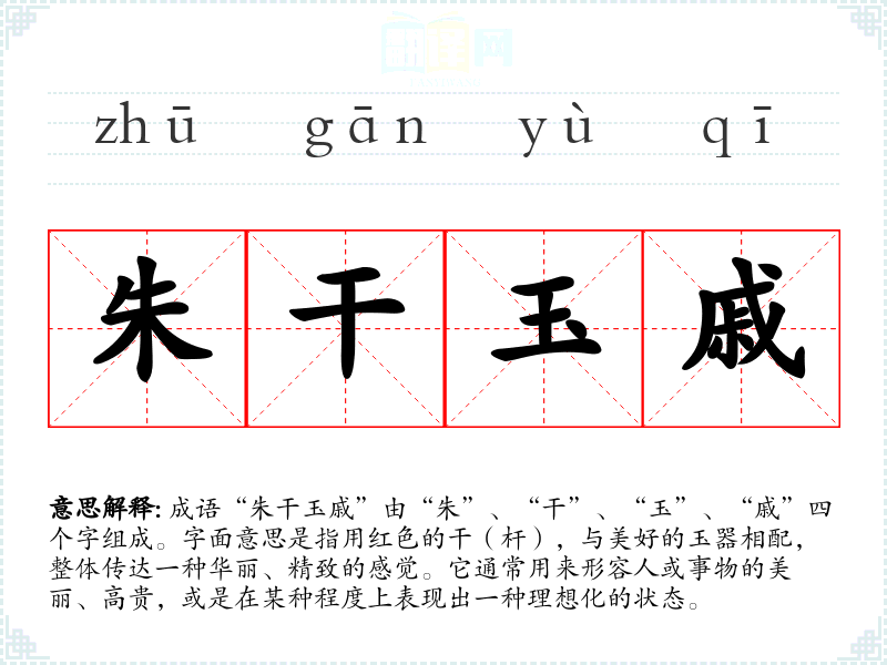 成语“朱干玉戚”由“朱”、“干”、“玉”、“戚”四个字组成。字面意思是指用红色的干(杆),与美好的玉器相配,整体传达一种华丽、精致的感觉。它通常用来形容人或事物的美丽、高贵,或是在某种程度上表现出一种理想化的状态。