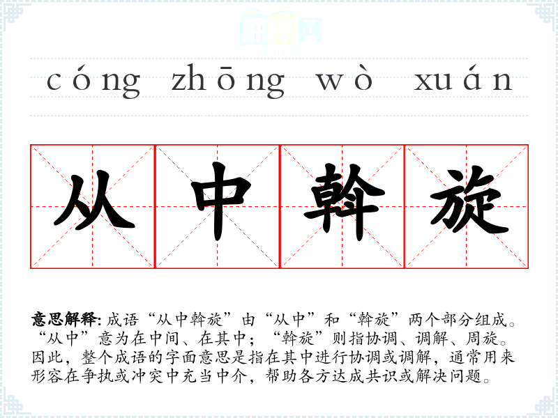 成语“从中斡旋”由“从中”和“斡旋”两个部分组成。“从中”意为在中间、在其中;“斡旋”则指协调、调解、周旋。因此,整个成语的字面意思是指在其中进行协调或调解,通常用来形容在争执或冲突中充当中介,帮助各方达成共识或解决问题。
