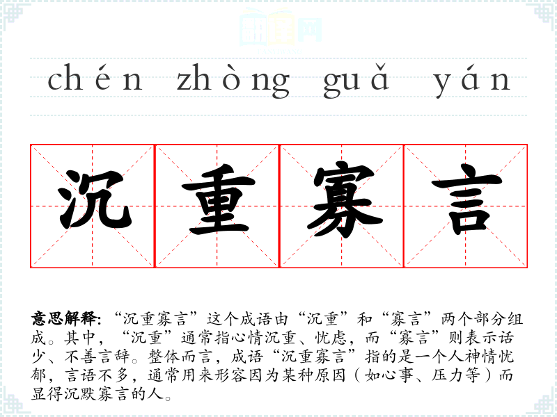 “沉重寡言”这个成语由“沉重”和“寡言”两个部分组成。其中,“沉重”通常指心情沉重、忧虑,而“寡言”则表示话少、不善言辞。整体而言,成语“沉重寡言”指的是一个人神情忧郁,言语不多,通常用来形容因为某种原因(如心事、压力等)而显得沉默寡言的人。