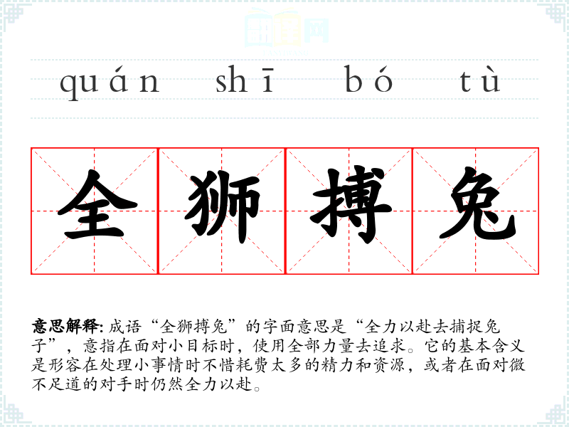在现代社会中,尤其是在工作和生活压力越来越大的背景下,许多人往往会在一些小事情上过度投入,反映出社会对效率和成果的追求。使用“全狮搏兔”可以提醒人们要理性对待目标,避免在小事上浪费精力。