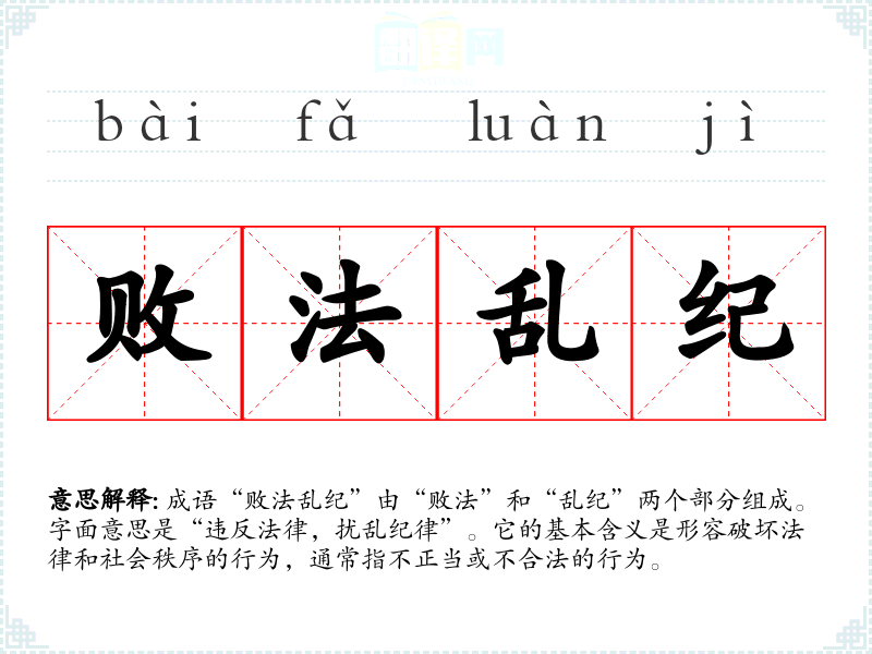 成语“败法乱纪”由“败法”和“乱纪”两个部分组成。字面意思是“违反法律,扰乱纪律”。它的基本含义是形容破坏法律和社会秩序的行为,通常指不正当或不合法的行为。