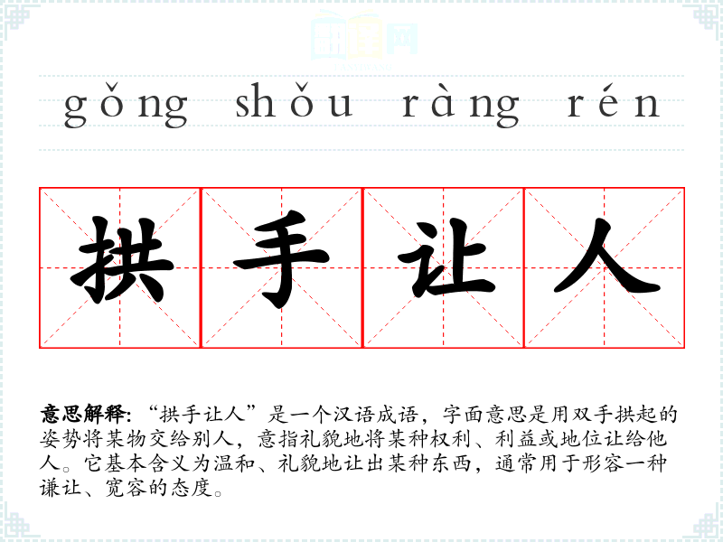 “拱手让人”是一个汉语成语,字面意思是用双手拱起的姿势将某物交给别人,意指礼貌地将某种权利、利益或地位让给他人。它基本含义为温和、礼貌地让出某种东西,通常用于形容一种谦让、宽容的态度。