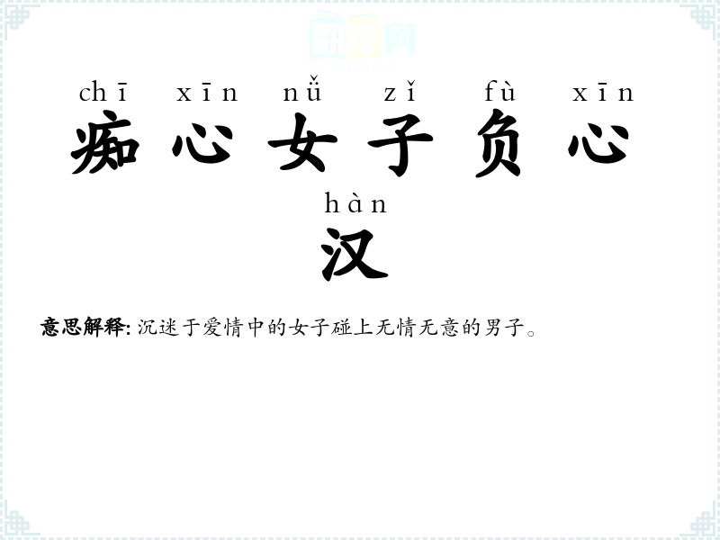 痴:入迷;负心:对爱情不忠。痴迷爱情的女子碰上无情无义的男人。 |