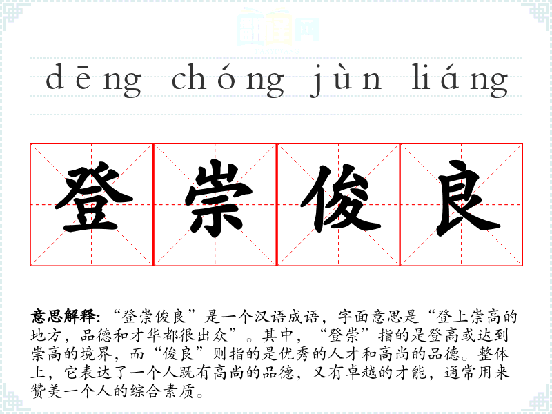 这一成语的具体来源并没有详细的文献记载,但可以推测其形成与古代对人才的尊重和对道德品质的重视有密切关系。在**传统文化中,士人被认为应该有“德才兼备”的理想,因此“登崇俊良”可以视为对这种理想的具体表达。