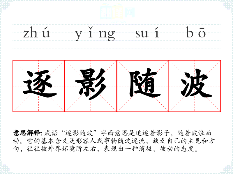 “逐影随波”并没有明确的历史典故或文学出处,但它的构成元素“逐影”和“随波”都可以在古代诗文中找到类似的表达,反映了一种对自然现象的观察和哲学思考。这个成语可视为对人生态度的一种隐喻,强调人们在生活中常常受到周围环境的影响,难以坚持自己的信念和目标。