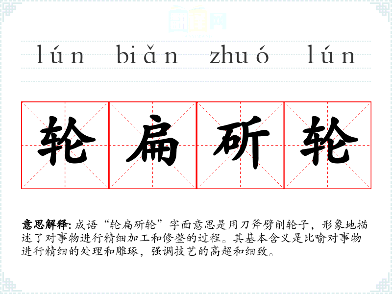 成语“轮扁斫轮”字面意思是用刀斧劈削**,形象地描述了对事物进行精细加工和修整的过程。其基本含义是比喻对事物进行精细的处理和雕琢,强调技艺的高超和细致。