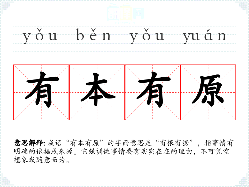 成语“有本有原”的字面意思是“有根有据”,指事情有明确的依据或来源。它强调做事情要有实实在在的理由,不可凭空想象或随意而为。