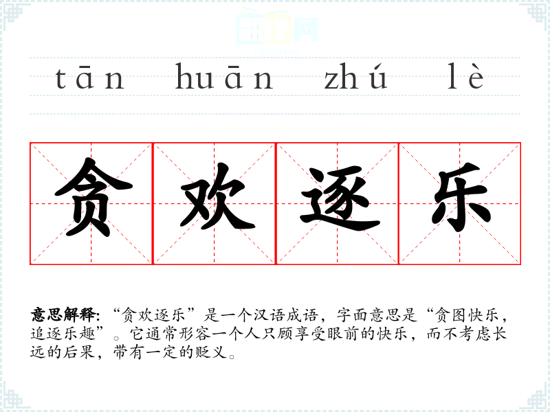 “贪欢逐乐”是一个汉语成语,字面意思是“贪图快乐,追逐乐趣”。它通常形容一个人只顾享受眼前的快乐,而不考虑长远的后果,带有一定的贬义。