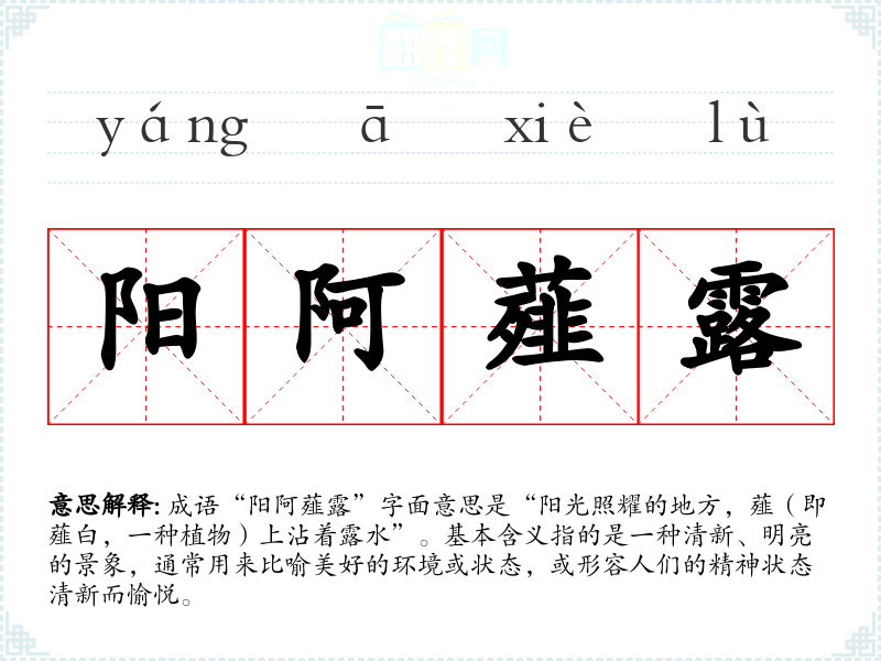 成语“阳阿薤露”字面意思是“阳光照耀的地方,薤(即薤白,一种植物)上沾着露水”。基本含义指的是一种清新、明亮的景象,通常用来比喻美好的环境或状态,或形容人们的精神状态清新而愉悦。