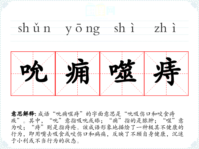 成语“吮痈噬痔”的字面意思是“吮吸伤口和咬食痔疾”。其中,“吮”意指吸吮或舔;“痈”指的是脓肿;“噬”意为咬;“痔”则是指痔疮。该成语形象地描绘了一种极其不健康的行为,即用嘴去吸食或咬伤口和病痛,反映了不顾自身健康,沉迷于小利或不当行为的状态。
