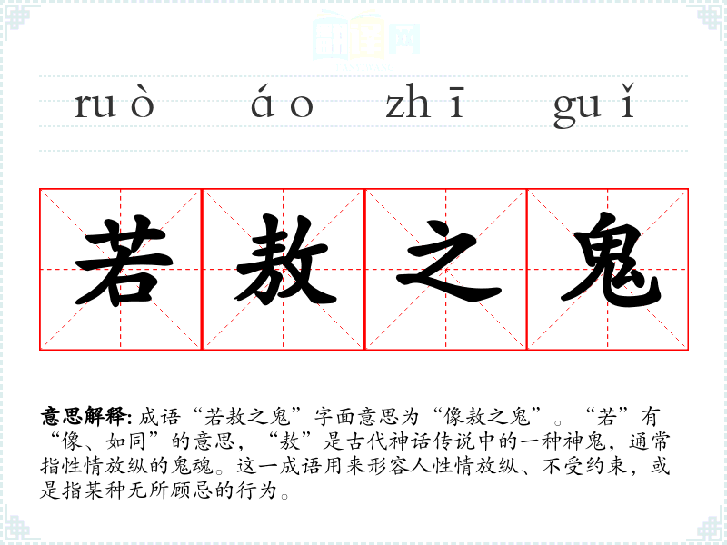 成语“若敖之鬼”字面意思为“像敖之鬼”。“若”有“像、如同”的意思,“敖”是古代神话传说中的一种神鬼,通常指性情放纵的鬼魂。这一成语用来形容人性情放纵、不受约束,或是指某种无所顾忌的行为。