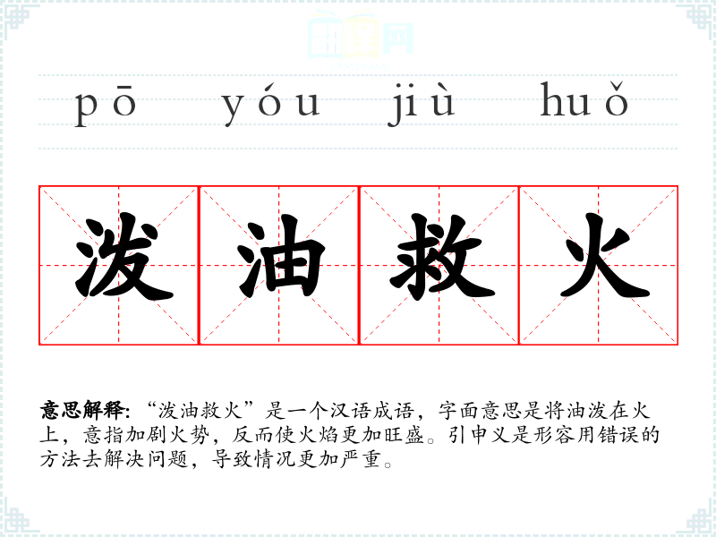 “泼油救火”是一个汉语成语,字面意思是将油泼在火上,意指加剧火势,反而使火焰更加旺盛。引申义是形容用错误的方法去解决问题,导致情况更加严重。