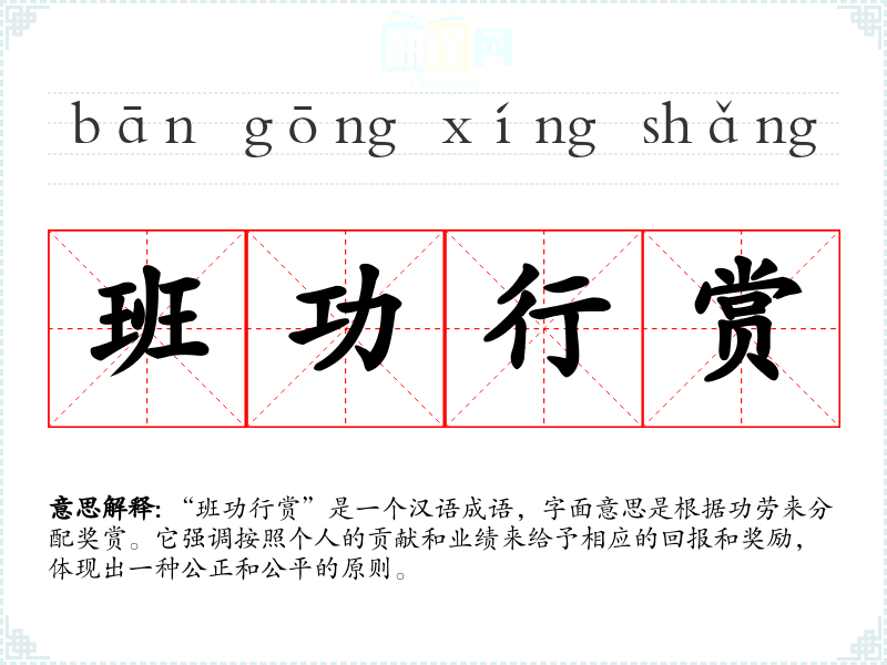“班功行赏”是一个汉语成语,字面意思是根据功劳来分配奖赏。它强调按照个人的贡献和业绩来给予相应的回报和奖励,体现出一种公正和公平的原则。