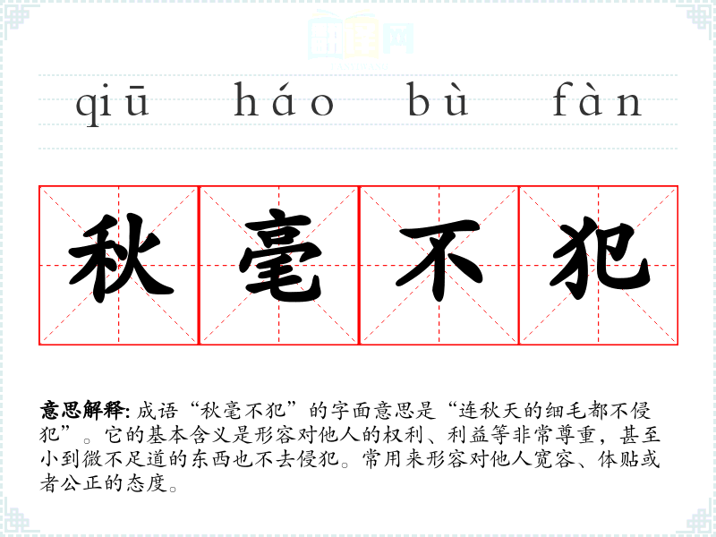 成语“秋毫不犯”的字面意思是“连秋天的细毛都不侵犯”。它的基本含义是形容对他人的权利、利益等非常尊重,甚至小到微不足道的东西也不去侵犯。常用来形容对他人宽容、体贴或者公正的态度。