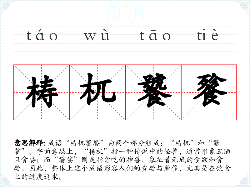 成语“梼杌饕餮”由两个部分组成:“梼杌”和“饕餮”。字面意思上,“梼杌”指一种传说中的怪兽,通常形象丑陋且贪婪;而“饕餮”则是指贪吃的神兽,象征着无底的食欲和贪婪。因此,整体上这个成语形容人们的贪婪与奢侈,尤其是在饮食上的过度追求。