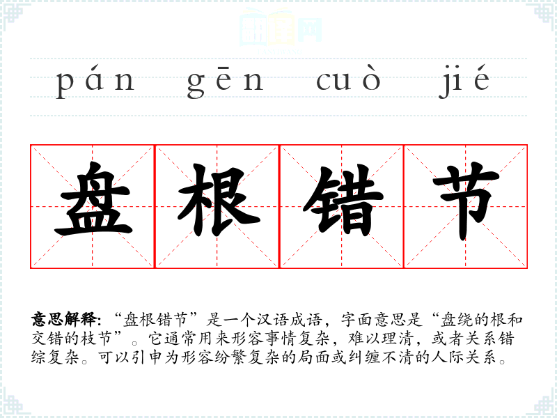 “盘根错节”是一个汉语成语,字面意思是“盘绕的根和交错的枝节”。它通常用来形容事情复杂,难以理清,或者关系错综复杂。可以引申为形容纷繁复杂的局面或纠缠不清的人际关系。