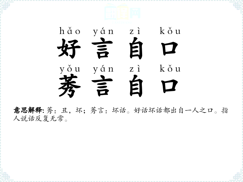 莠:丑,坏;莠言:坏话。好话坏话都出自一人之口。指人说话反复无常。 |