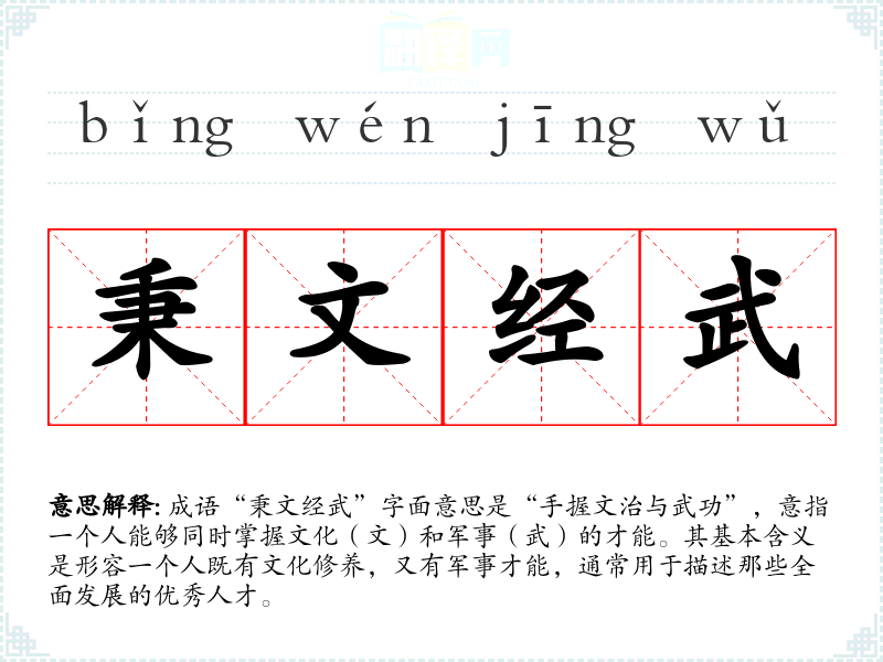 成语“秉文经武”字面意思是“手握文治与武功”,意指一个人能够同时掌握文化(文)和军事(武)的才能。其基本含义是形容一个人既有文化修养,又有军事才能,通常用于描述那些全面发展的优秀人才。