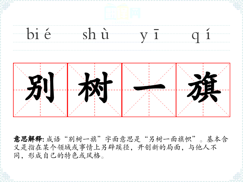 成语“别树一旗”字面意思是“另树一面旗帜”。基本含义是指在某个领域或事情上另辟蹊径,开创新的局面,与他人不同,形成自己的特色或风格。