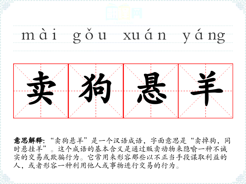 在英语中,类似的表达可以是“to sell a pig in a poke”,意指在未充分了解的情况下进行交易,这与“卖狗悬羊”在强调交易不透明和欺骗性质上有相似之处。这样的比较可以反映出不同文化中对诚信和交易的共同关注。
