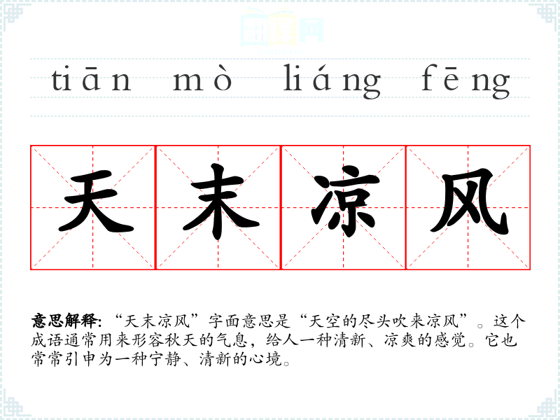 “天末凉风”字面意思是“天空的尽头吹来凉风”。这个成语通常用来形容秋天的气息,给人一种清新、凉爽的感觉。它也常常引申为一种宁静、清新的心境。