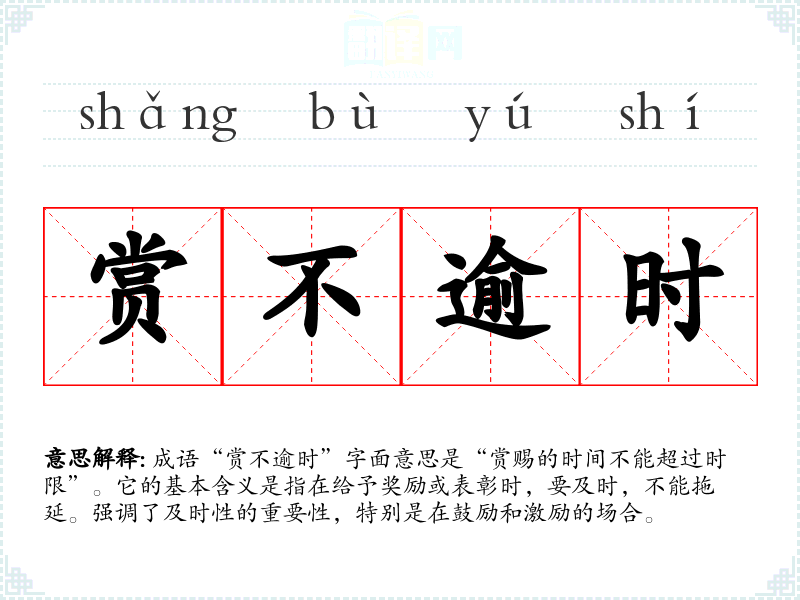 “赏不逾时”出自古代文献,体现了古人对于时效性和效率的重视。虽然没有明确的典故,但可以理解为与古代官府对士人的奖励制度相关,表明在对人才的赏赐上要及时,以激励他们的表现。