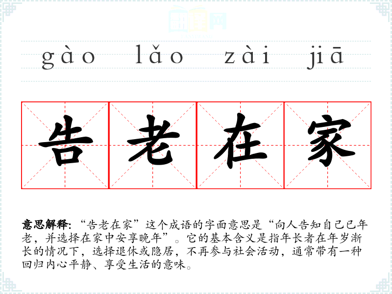 通过对“告老在家”的学,我深刻认识到这个成语不仅仅是关于年老与隐退的表面意思,更是对生活态度的一种反映。在语言学和表达中,理解成语的深层意义可以丰富我们的表达方式,帮助我们更好地传达情感和思想。