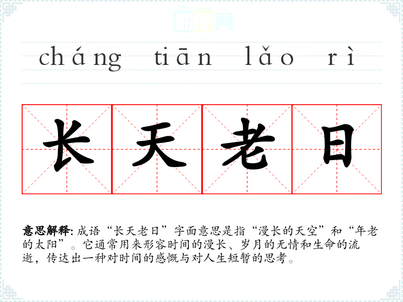 成语“长天老日”字面意思是指“漫长的天空”和“年老的太阳”。它通常用来形容时间的漫长、岁月的无情和生命的流逝,传达出一种对时间的感慨与对人生短暂的思考。