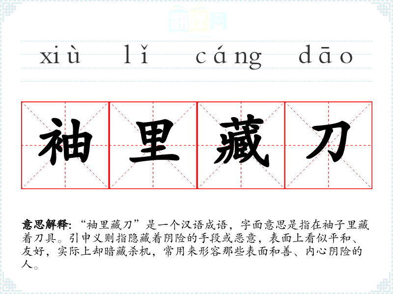 “袖里藏刀”是一个汉语成语,字面意思是指在袖子里藏着刀具。引申义则指隐藏着阴险的手段或恶意,表面上看似平和、友好,实际上却暗藏杀机,常用来形容那些表面和善、内心阴险的人。
