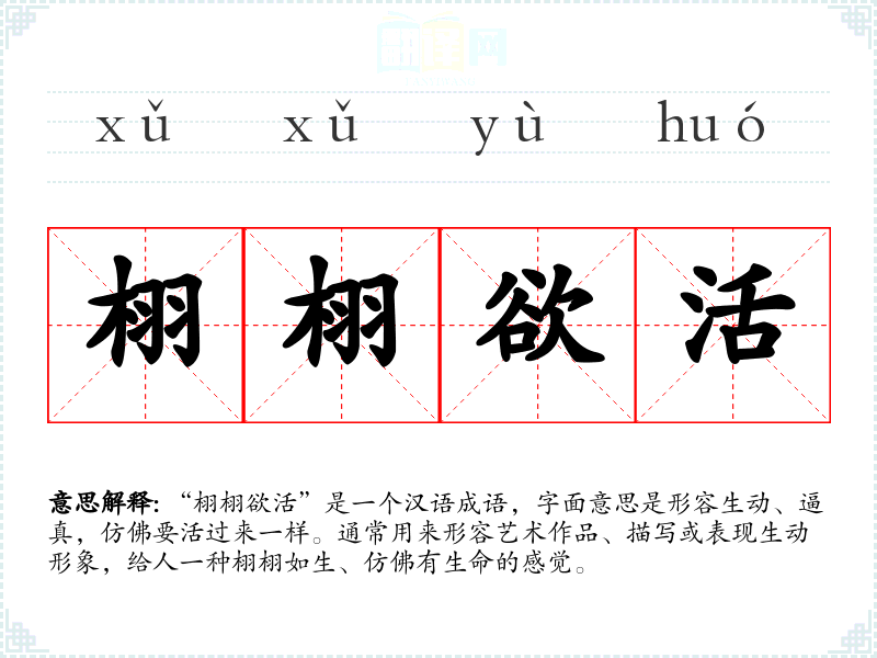 这个成语的来源可以追溯到《庄子·齐物论》,原文中提到“栩栩如生”,表达事物生动形象的状态。“栩栩”本身就有生动形象的意思,而“欲活”则进一步强调这种生动程度,意味着仿佛要活过来一般,传达出一种强烈的生命感。