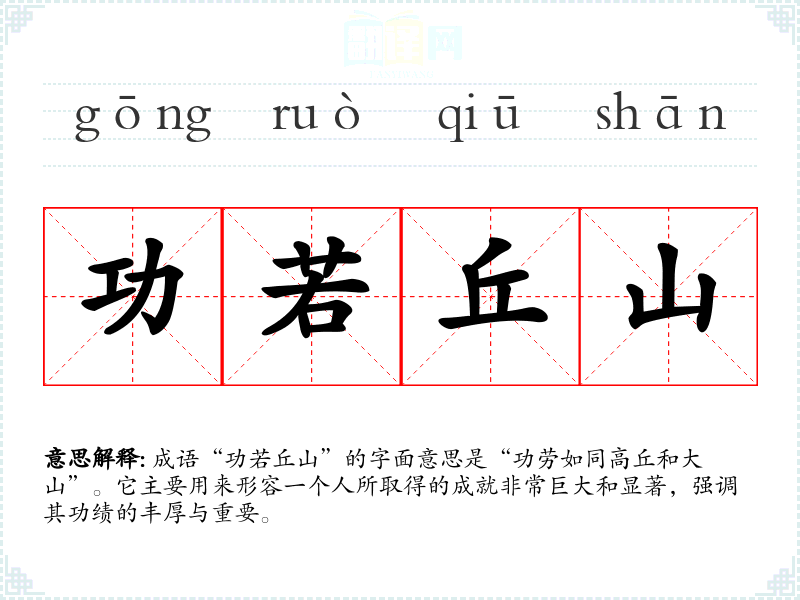 成语“功若丘山”的字面意思是“功劳如同高丘和大山”。它主要用来形容一个人所取得的成就非常巨大和显著,强调其功绩的丰厚与重要。