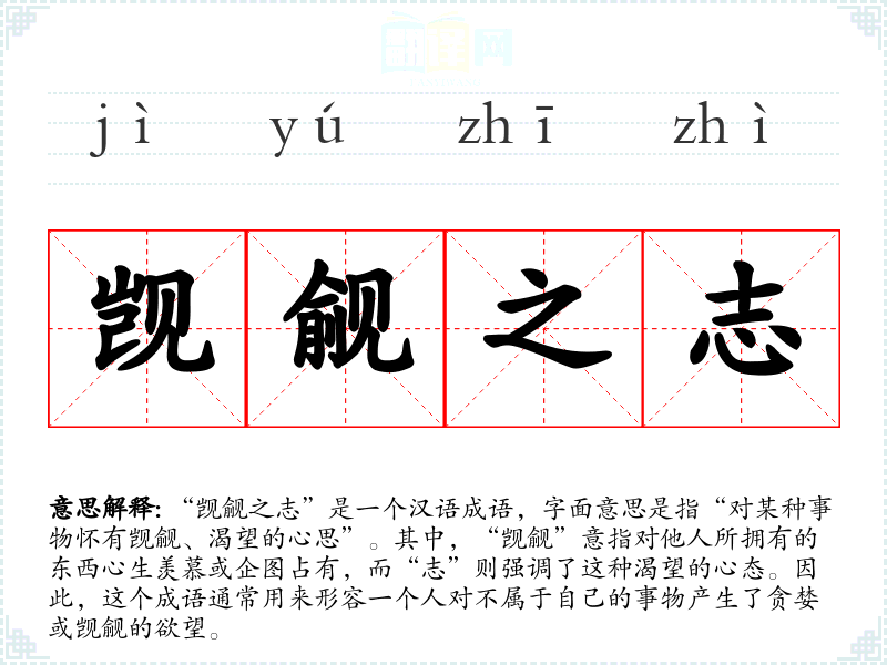 “觊觎之志”是一个汉语成语,字面意思是指“对某种事物怀有觊觎、渴望的心思”。其中,“觊觎”意指对他人所拥有的东西心生羡慕或企图占有,而“志”则强调了这种渴望的心态。因此,这个成语通常用来形容一个人对不属于自己的事物产生了贪婪或觊觎的欲望。