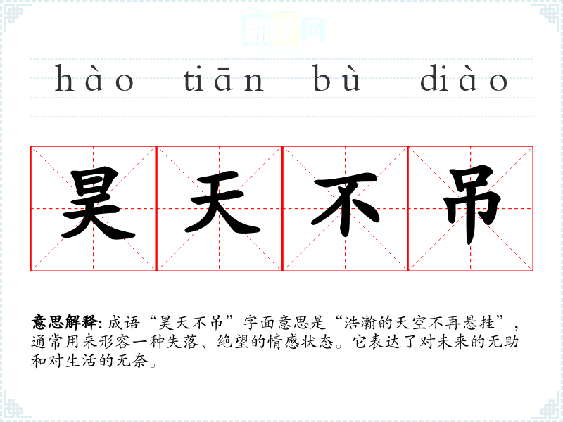 成语“昊天不吊”字面意思是“浩瀚的天空不再悬挂”,通常用来形容一种失落、绝望的情感状态。它表达了对未来的无助和对生活的无奈。