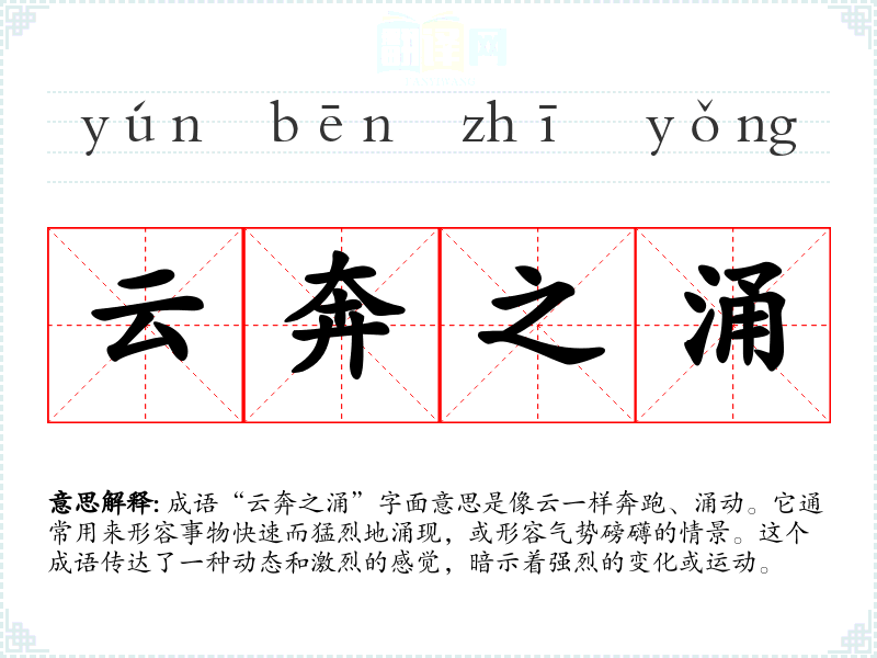 成语“云奔之涌”字面意思是像云一样奔跑、涌动。它通常用来形容事物快速而猛烈地涌现,或形容气势磅礴的情景。这个成语传达了一种动态和激烈的感觉,暗示着强烈的变化或**。